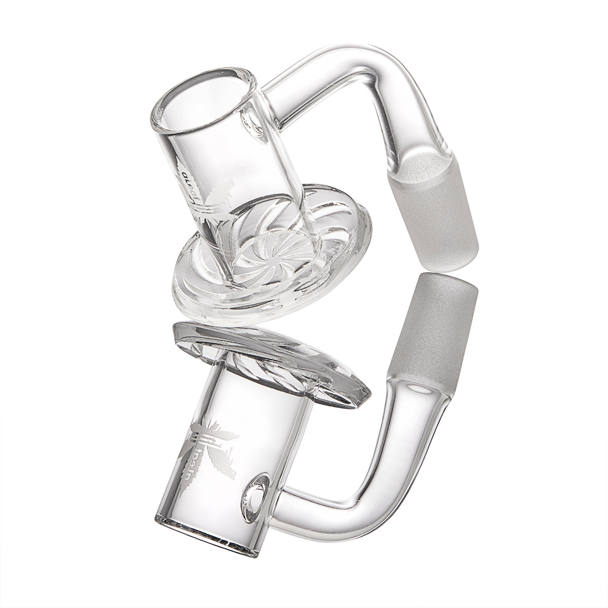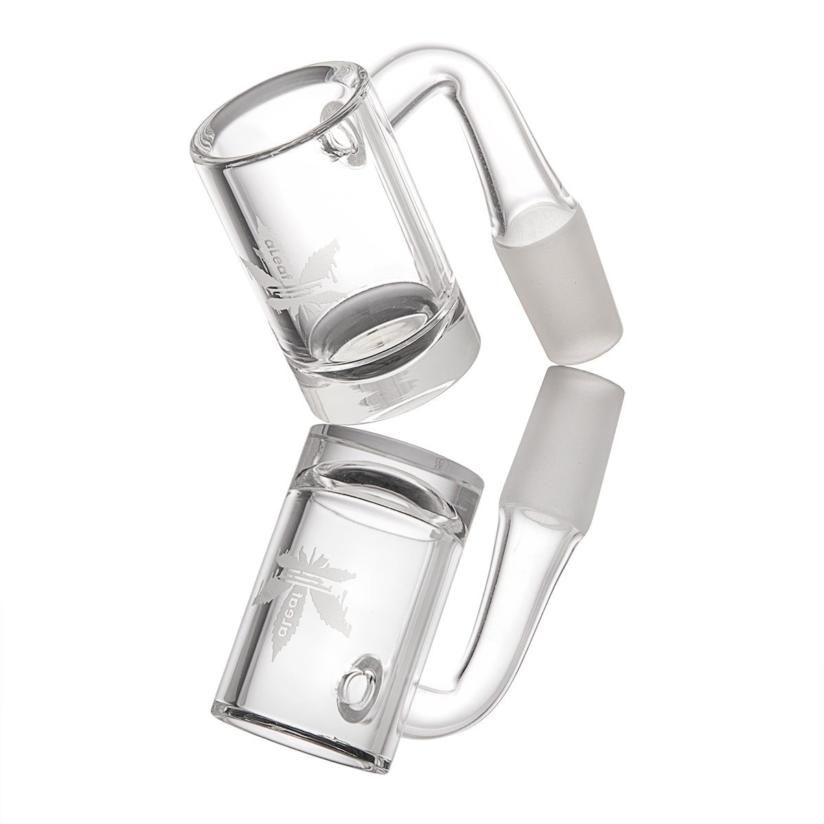 The aLeaf Bottom Engraved Banger is built with 99.9% Quartz material, promising durability and long-lasting performance. It is available in both 14mm and 18mm joint sizes, offering versatility to accommodate your needs. The banger design is clear, letting you witness the magical transformations within.